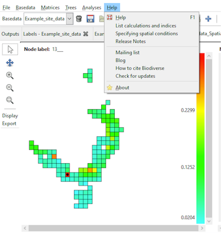 You can access a range of Biodiverse Help Topics by clicking on the Help option on the menu bar within the Biodiverse application (see image below). You can also hover the mouse pointer over most buttons and menu items in Biodiverse to view their associated tooltips.