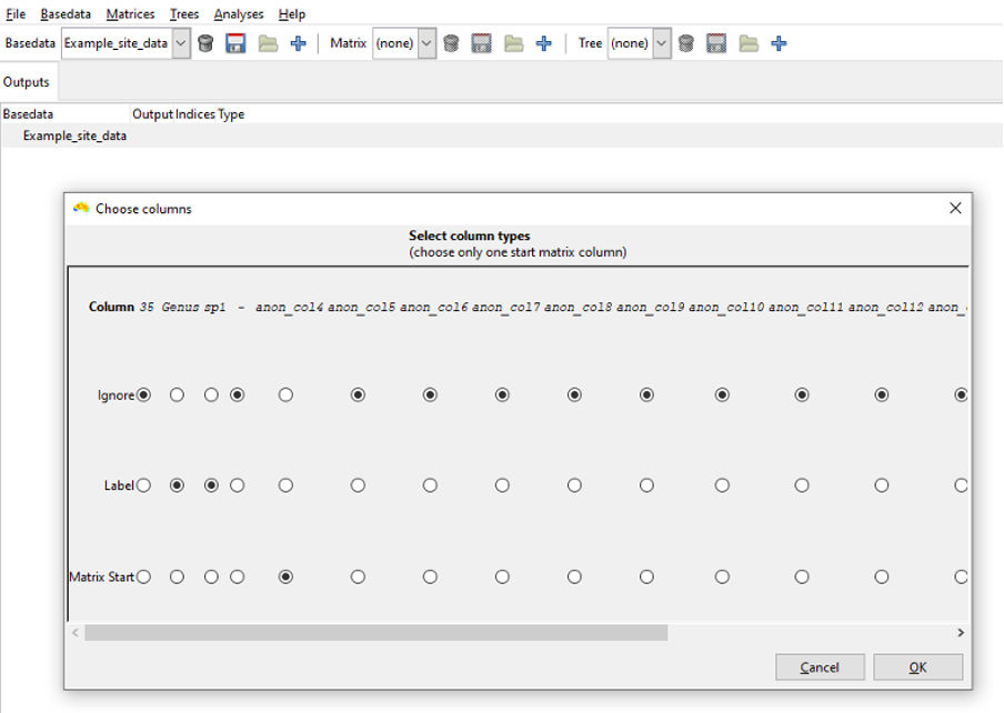 If you are not importing the Example_site_data.csv file, bear in mind you might need to check some of the other import options. A useful option is ‘Allow empty groups’ which lets you have groups that are considered for analysis, but that have no labels themselves. This is useful when you wish to have moving window analyses extend beyond the sampled data to give a smoother result.