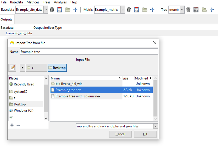 Trees – (file extension .bts) these are hierarchical tree structures, e.g. phylogenies, taxonomies or word roots, which are imported from nexus and similar formats. These are used for analyses involving tree structures, e.g. phylogenetic diversity, linked by the matching labels in a BaseData.