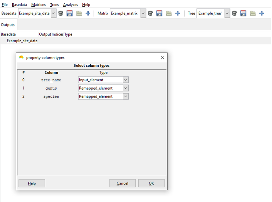 A popup dialog now prompts you to specify the column types for the remap process. Specify as many input_element columns as the tree labels have (i.e. one for nexus files) and then each label column in the BaseData object must be designated as a remapped_element. Click OK. The system will import the tree and perform the remapping.