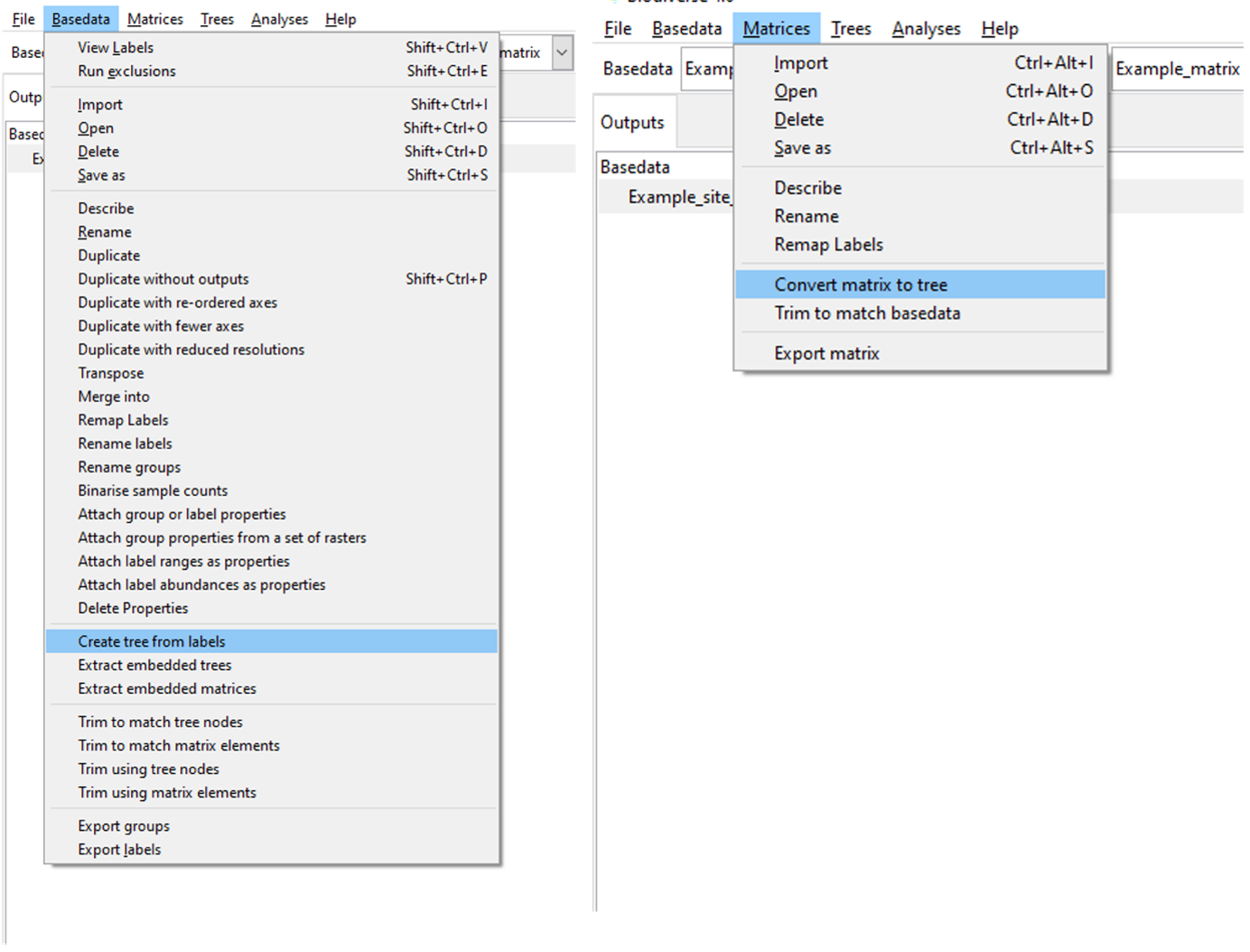Deriving a Tree You can derive a Tree from a BaseData object or Matrix at any time. Select the “Create tree from labels” or “Convert matrix to tree” options under the BaseData and Matrix menus, respectively: