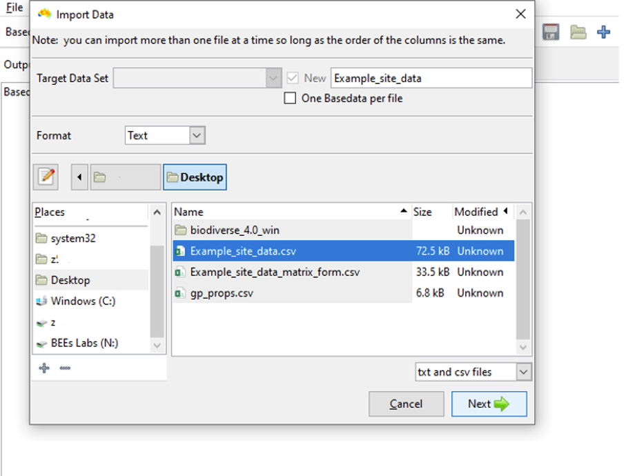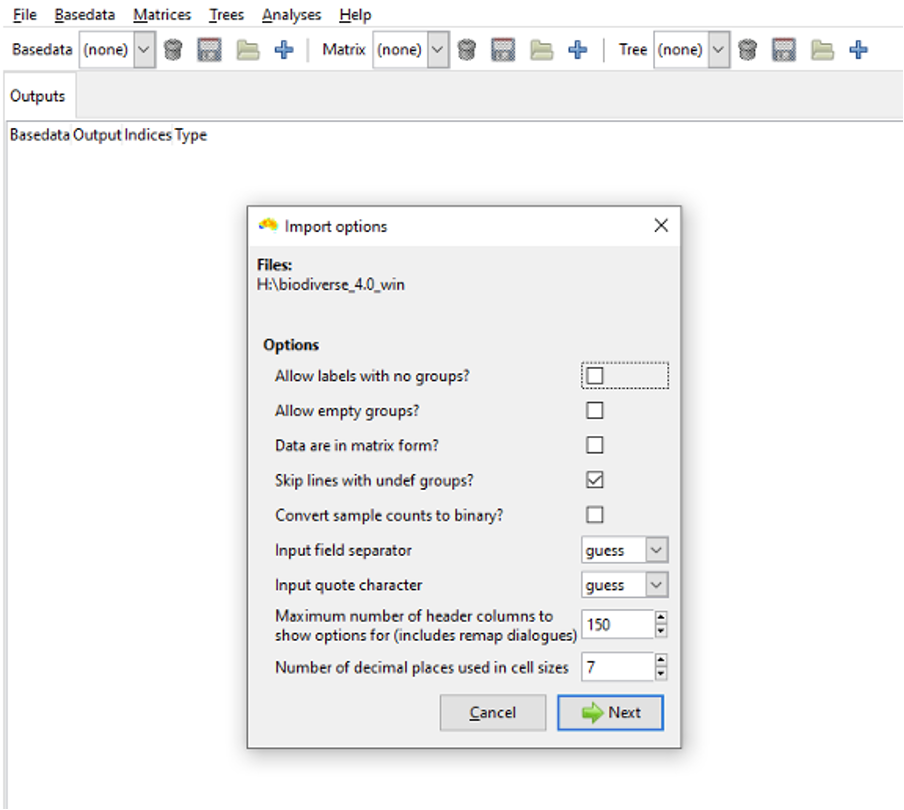 BaseData, Matrix, and Tree object data can be imported from ‘raw’ data files (e.g. Tabular text, rasters, shapefiles, spreadsheets or CSV text files in the case of BaseData and Matrix objects) by clicking on their respective import buttons