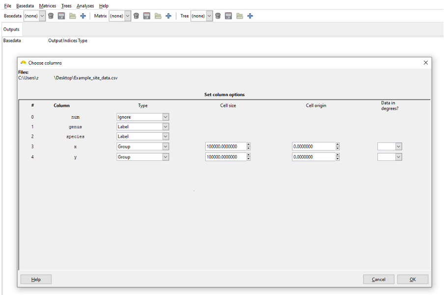 When a Group column has been set you will be given the option to select its cell size (in the same units as the group data is stored) and its origin. If you are not importing the Example_site_data.csv file, make sure these dimensions and units are appropriate to your data. You can specify if the group data are degrees using the Data in degrees? comboboxes. This allows you to import data in degrees minutes seconds (e.g. 22° 15’ 10’’ S) and decimal degrees formats, as well as enabling some validation that the coordinate values are in the correct range for such units.