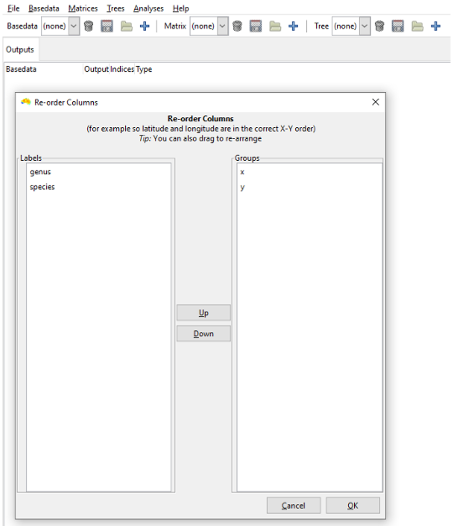 The Re-order Columns dialog box is the next window to appear. This allows you to order your labels and groups. For example, placing “y” above “x” makes the y column data the first dimension of a group’s coordinates and x the second (useful if latitude precedes longitude in the column order of your input file). If you forget this step then the axis order can be changed later on using the Duplicate with re-ordered axes tool under the BaseData menu.