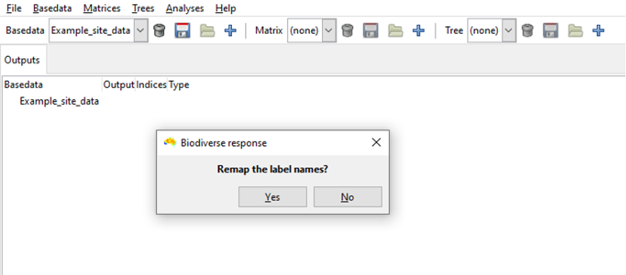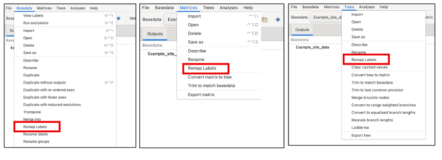 Whilst the user is prompted to remap when importing data, remapping can be performed during or after import. To remap after import, locate “remap label” under the BaseData, Tree and Matrix menus.