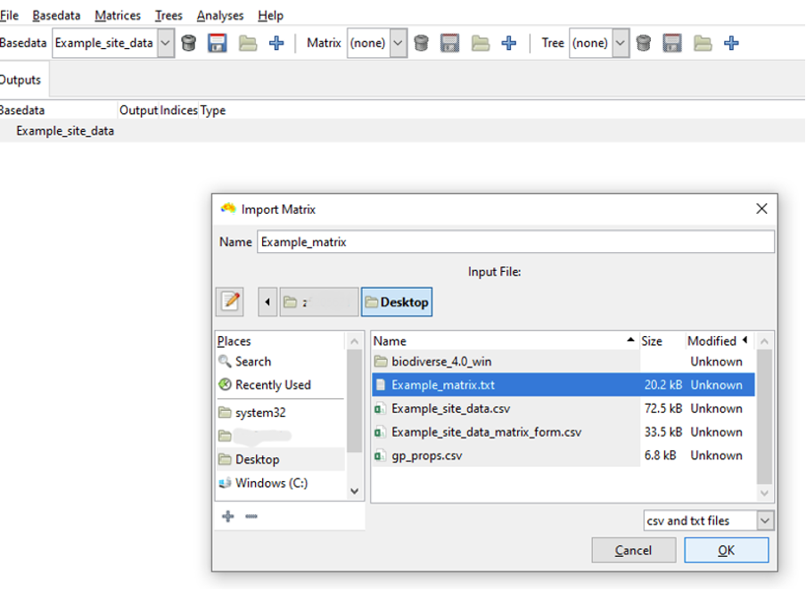 on the Matrix toolbar to open the Import Matrix dialogue window, from where you can select the input data file. Select Example_matrix.txt, give the new Matrix a name if you like, and click OK.