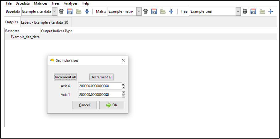 For most purposes, accept the index sizes suggested by the system (see here] for additional details on setting optimal index sizes). Note that index size refers to how finely Biodiverse divides spatial data into blocks for faster neighbour searching. Smaller blocks maximise precision but may involve more comparisons to identify the set of blocks to search (longer processing time). Larger blocks may compromise precision for faster processing time.