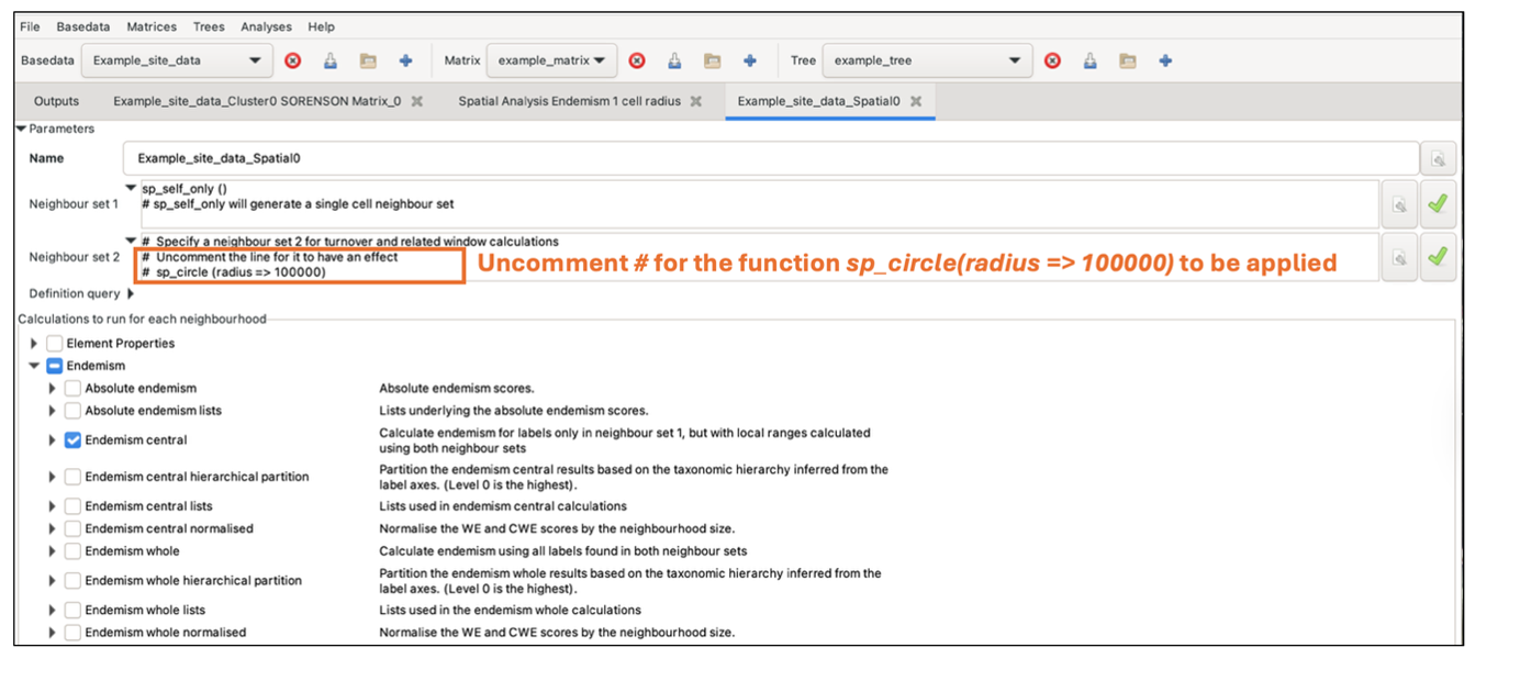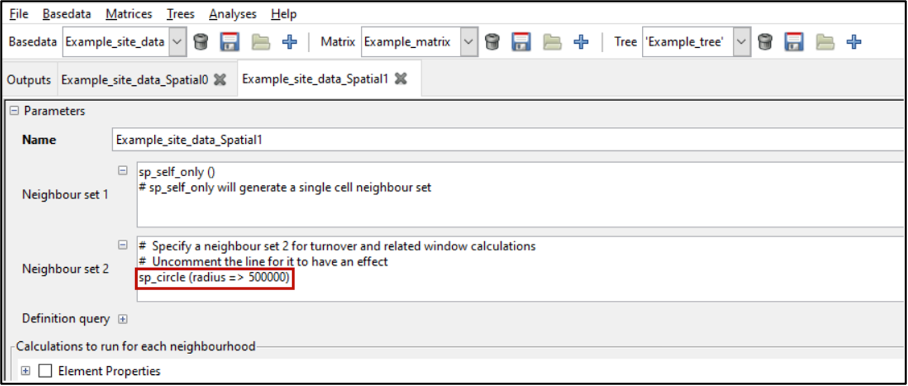 Note that the use of neighbourhoods varies according to the type of calculation selected for analysis (see Selecting Indices below). Some calculations aggregate the neighbourhoods into a single set (e.g. endemism_whole), others compare the labels in the first neighbour set with those in the second (e.g. Jaccard and other dissimilarity indices), while others use the first set to define the list of labels to use but then consider distributions across both neighbour sets (e.g. endemism_central). Some will not be run unless two neighbour sets are defined, primarily the turnover calculations.