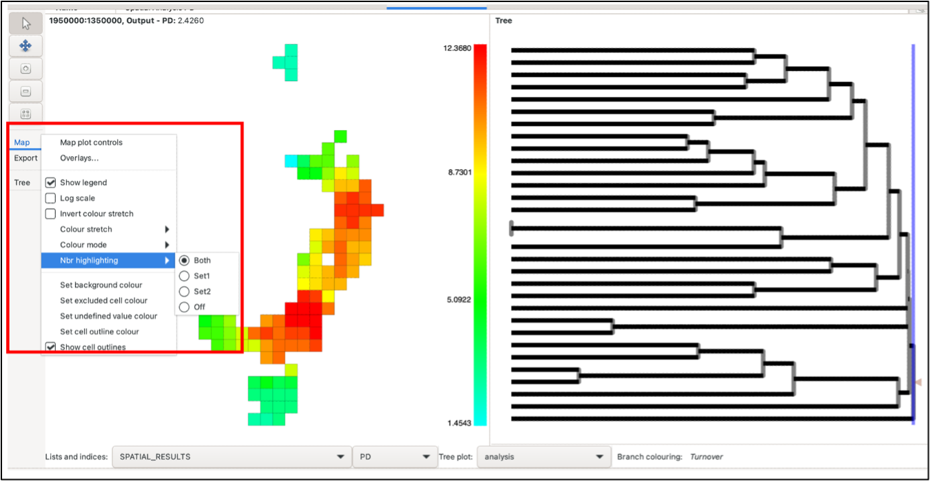 The tree branches are coloured according to whether they are found only in the first neighbour set (blue), the second neighbour set (red), both (black) or neither (grey). The screenshot above displays this. Also see the blog post. Some indices can also be plotted on the tree.