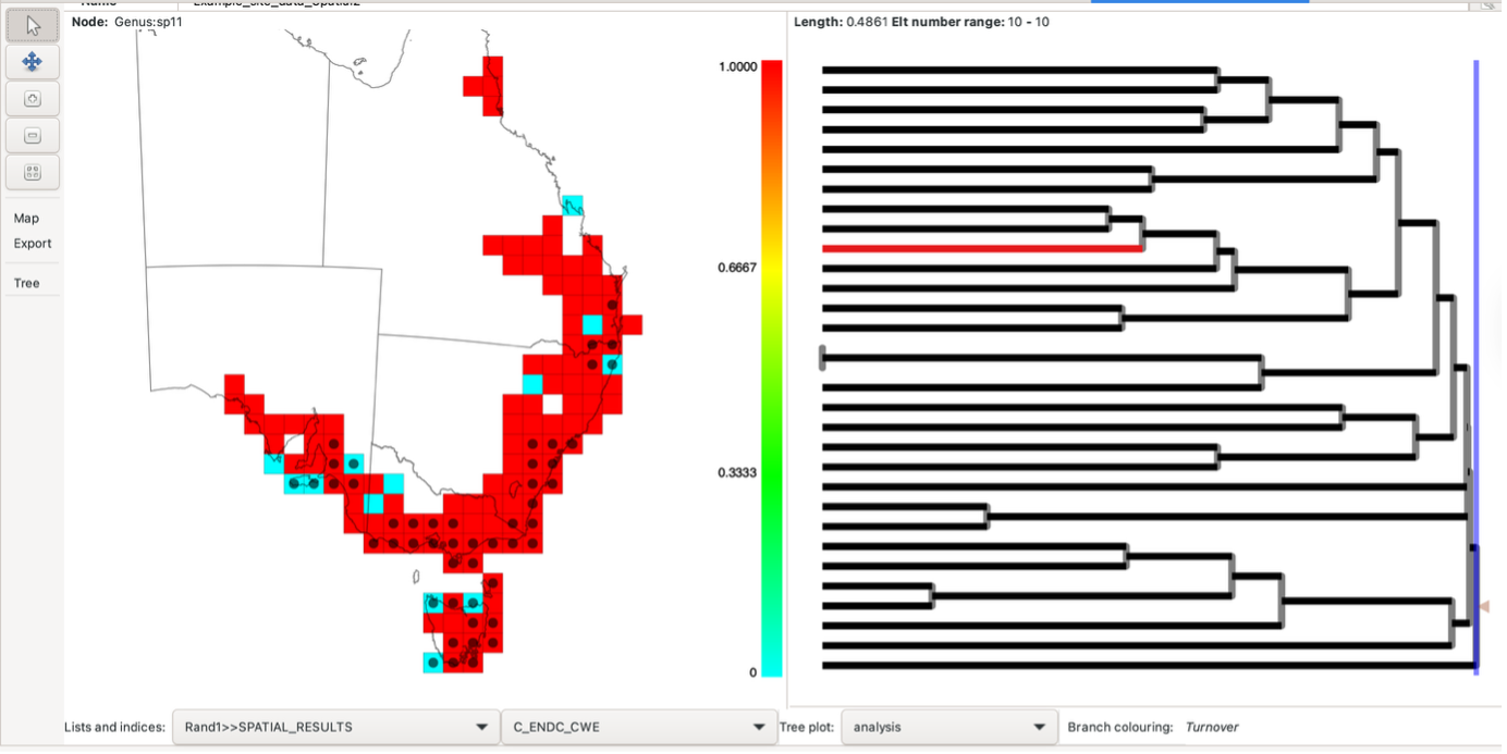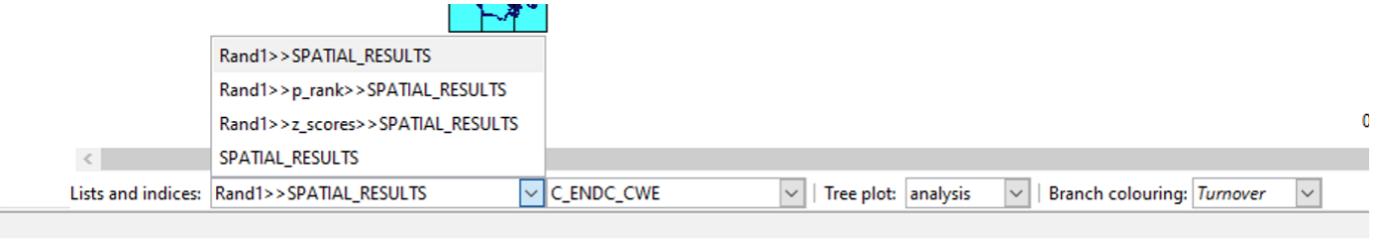 Note that the randomisation analysis tab does not show maps or any other displays once the specified number of iterations have completed. The results are added as lists to any existing analysis objects and can be displayed by selecting from the “List and Indices” option on the relevant plots. You might need to close any open plots and re-open them to see the new lists. See the main help system.