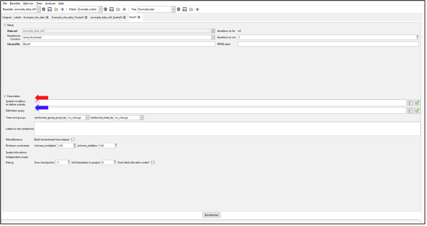 This can be readily fixed in Biodiverse by specifying a spatial condition to define subsets. Or, if you only want to randomise a subset of your data while holding the rest as-observed, you can use a definition query. You can specify spatial conditions using the same syntax as for the Spatial and Cluster analyses. The analytical decisions are yours but generally, it is better to use a condition that generates non-overlapping regions. Each group is allocated to only one subset, so in such overlapping cases it is the first one that contains a group “wins” that group.