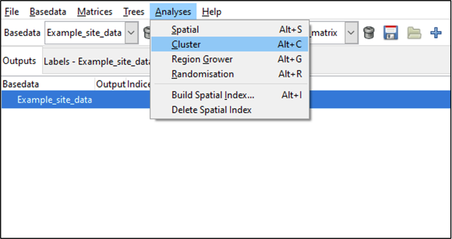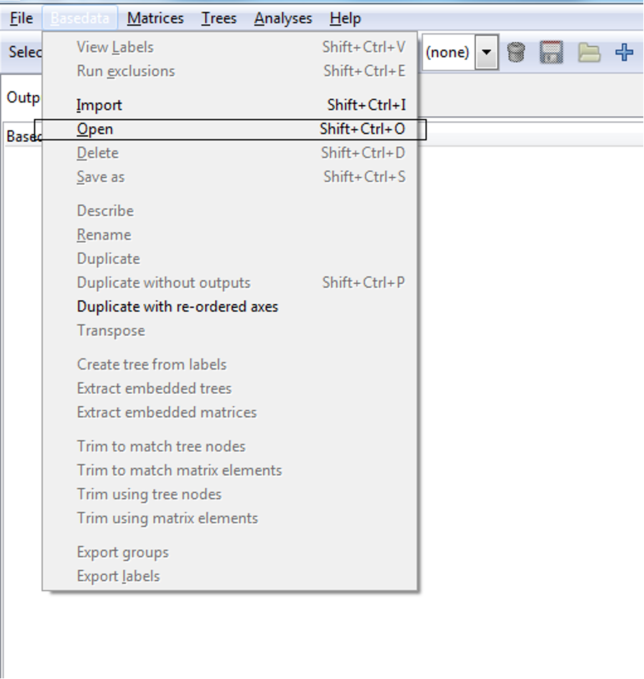 We will run a cluster analysis on the BaseData imported earlier ‘Example_new_basedata’ (see Importing data). If My_new_basedata is not loaded, but you have saved it, open this file now by clicking on ‘Open’ from the Basedata menu and navigating to the location of your bds file.