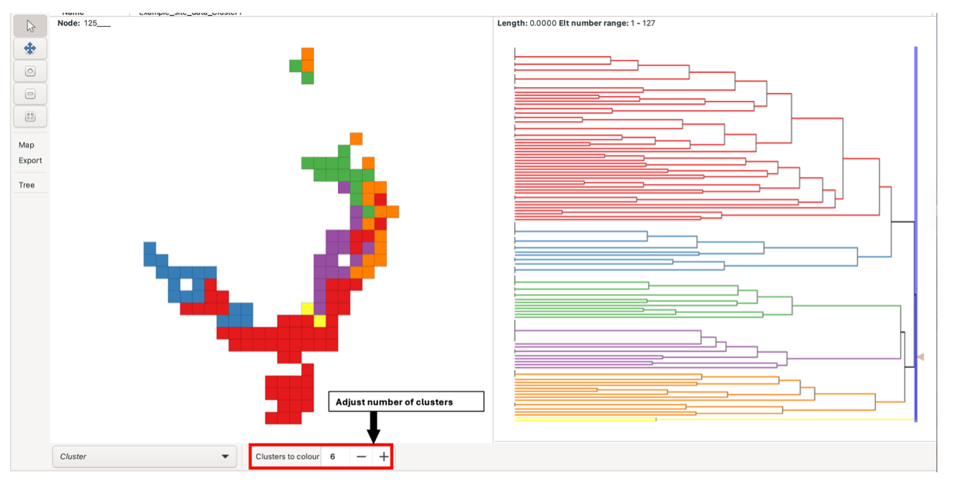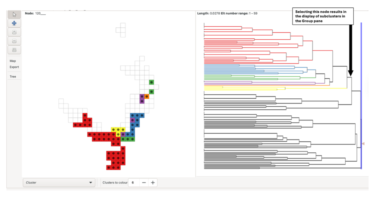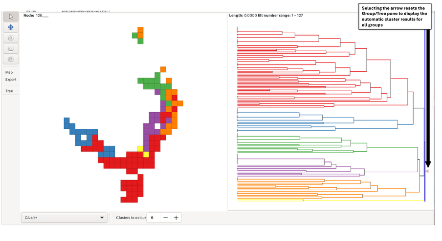 To view clustering analysis results for all BaseData, left-click the arrow at the right-most side of the tree pane. This selects the root branch, which may have a zero length. The number of clusters displayed can be adjusted using the “Colours to clusters” feature. Note there is a maximum of 13.