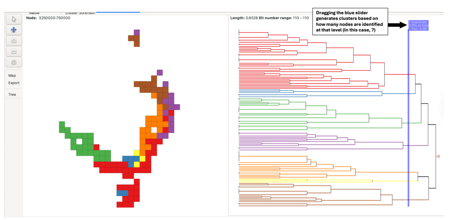 Alternatively, the blue sliding bar in the tree pane can be dragged across the tree to colour/cluster the nodes and groups at that level (e.g., a bar dragged over two nodes generates two clusters). The bar displays the number of nodes it is crossing when the mouse is focused on it. If the slider bar crosses more than 13 nodes, all nodes will be uniformly coloured red instead, and groups in the group grid will not be coloured.