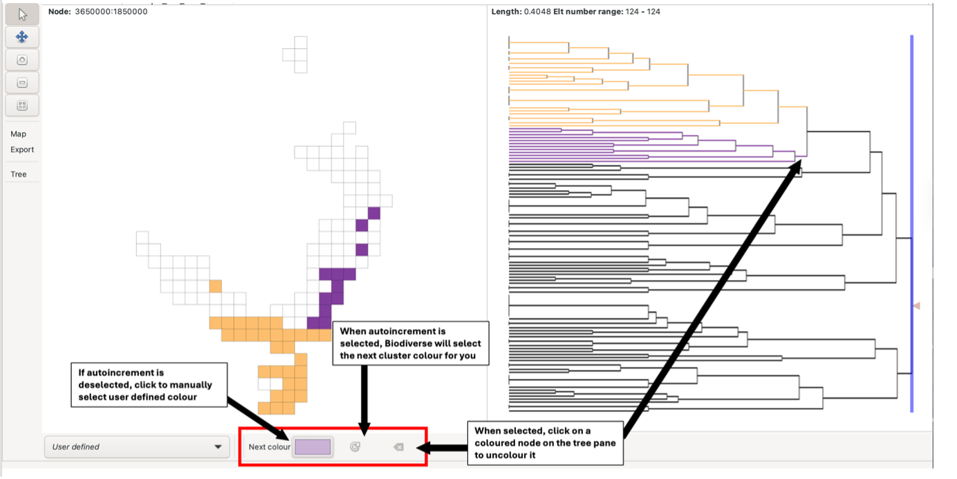 To do this, select user-defined in the selection list on the bottom toolbar. Select the preferred colour and then fill the group grid by selecting your user-defined cluster node on the tree pane. Selecting the autoincrement button will allow the system to select the next colour for you; deselecting this will keep the cluster colour the same until it is changed manually by the user. The deselect button allows you to uncolour clusters by selecting them on the tree pane.