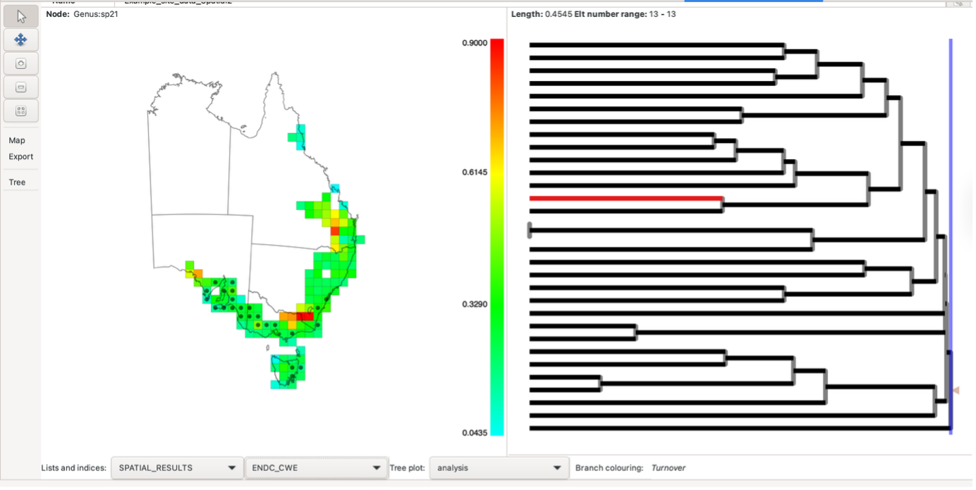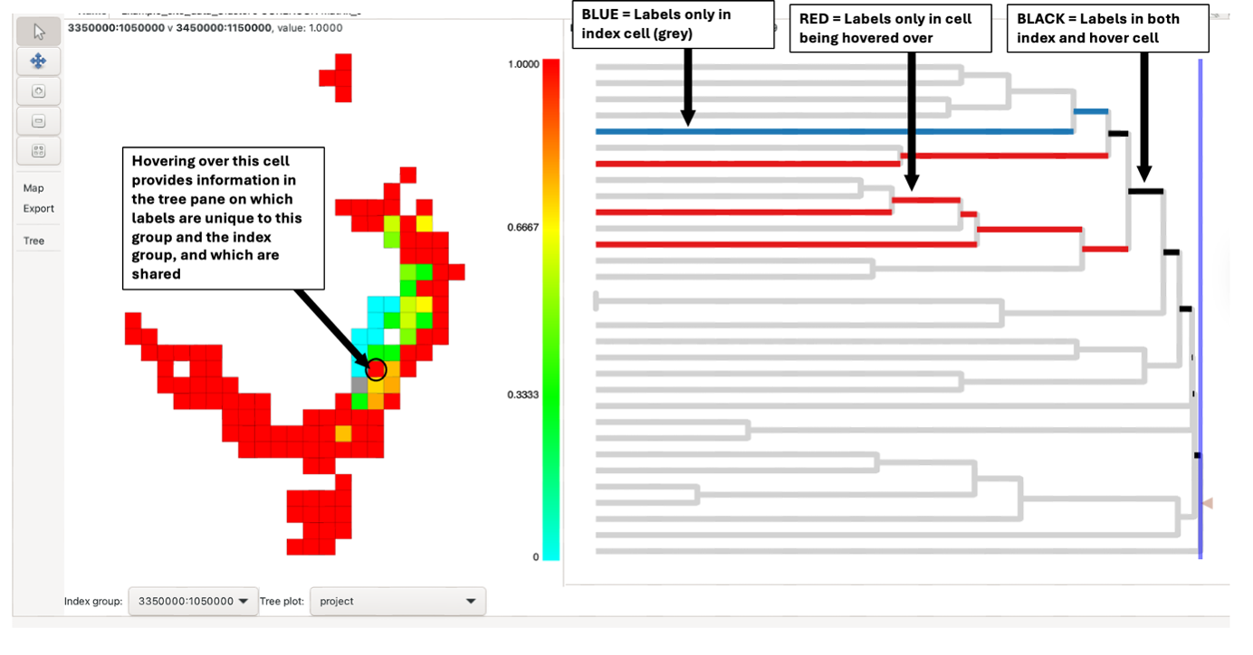 Note that hovering over different groups whilst the index group is selected will highlight additional branches. Blue branches are found only in the index cell; red branches are found only in the cell being hovered over. The branches in black are found in both neighbouring cells. Branches not found in the two cells are in grey (reduces visual impact without hiding it). See this blog post for further information about how Biodiverse visualises phylodiversity.