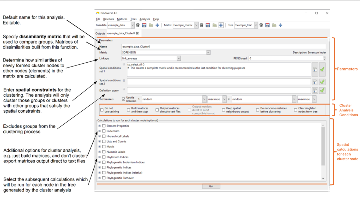 Click on the Go! button (keyboard shortcut Control-G). The system will first build the dissimilarity matrix (or matrices if you have several spatial conditions), then run the clustering using these matrices, and then any spatial calculations you have selected for each node. It will then prompt you to display results.