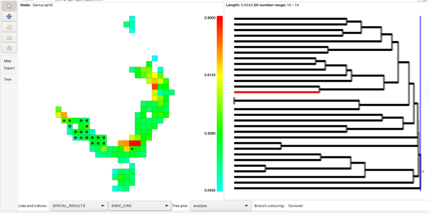 The results consist of a map and a tree pane. The map illustrates the degree of similarity or difference between each group and its cluster neighbours. By hovering over or right-clicking a group (index group), its dissimilarity value is displayed at the top of the map pane.